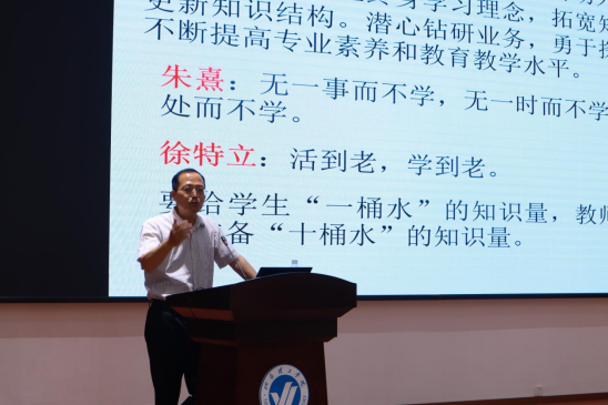 本次报告会特邀烟台大学化学化工学院院长李庆忠教授来我校进行教育分享。大会开始,由李庆忠教授对教师这一职业称谓做出全方位的解释。他从爱国守法、爱岗敬业、关爱学生、教书育人、为人师表、终身学习六个角度教师的职业规范进行阐述,通过列举古往今来多个榜样人物的经典故事,使老师们进一步明确了教学目标和教学方向。