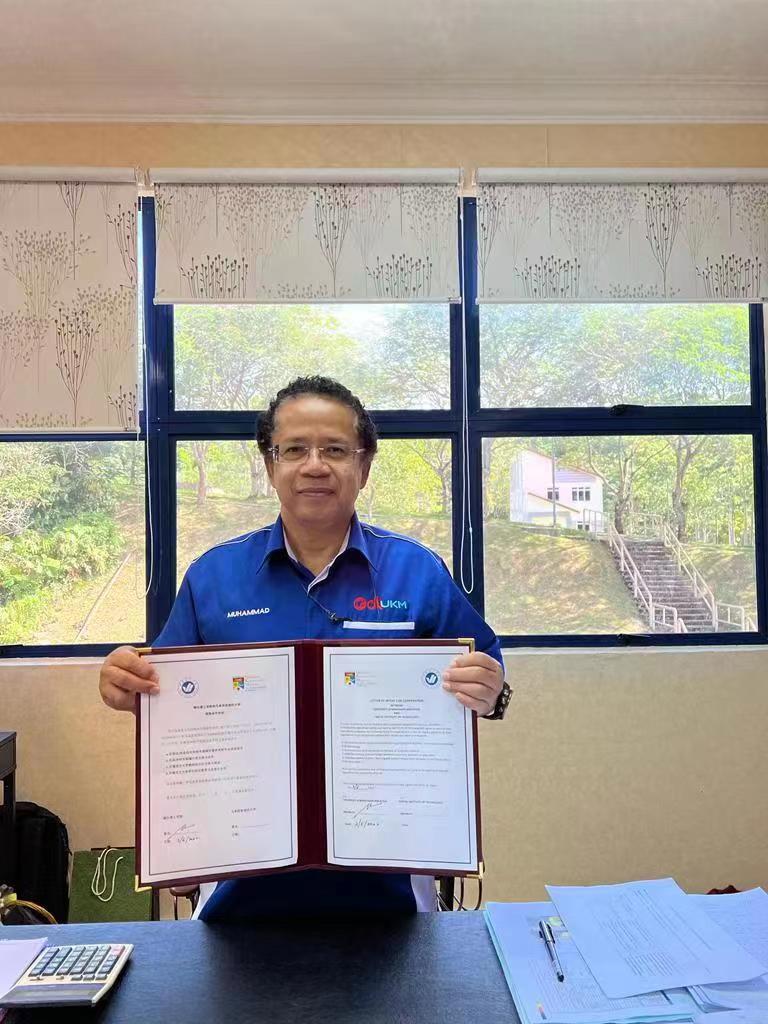 学校副校长夏毅、马来西亚国民大学国际部处长Prof.Datuk分别代表双方线上签署备忘录,并云合影留念。