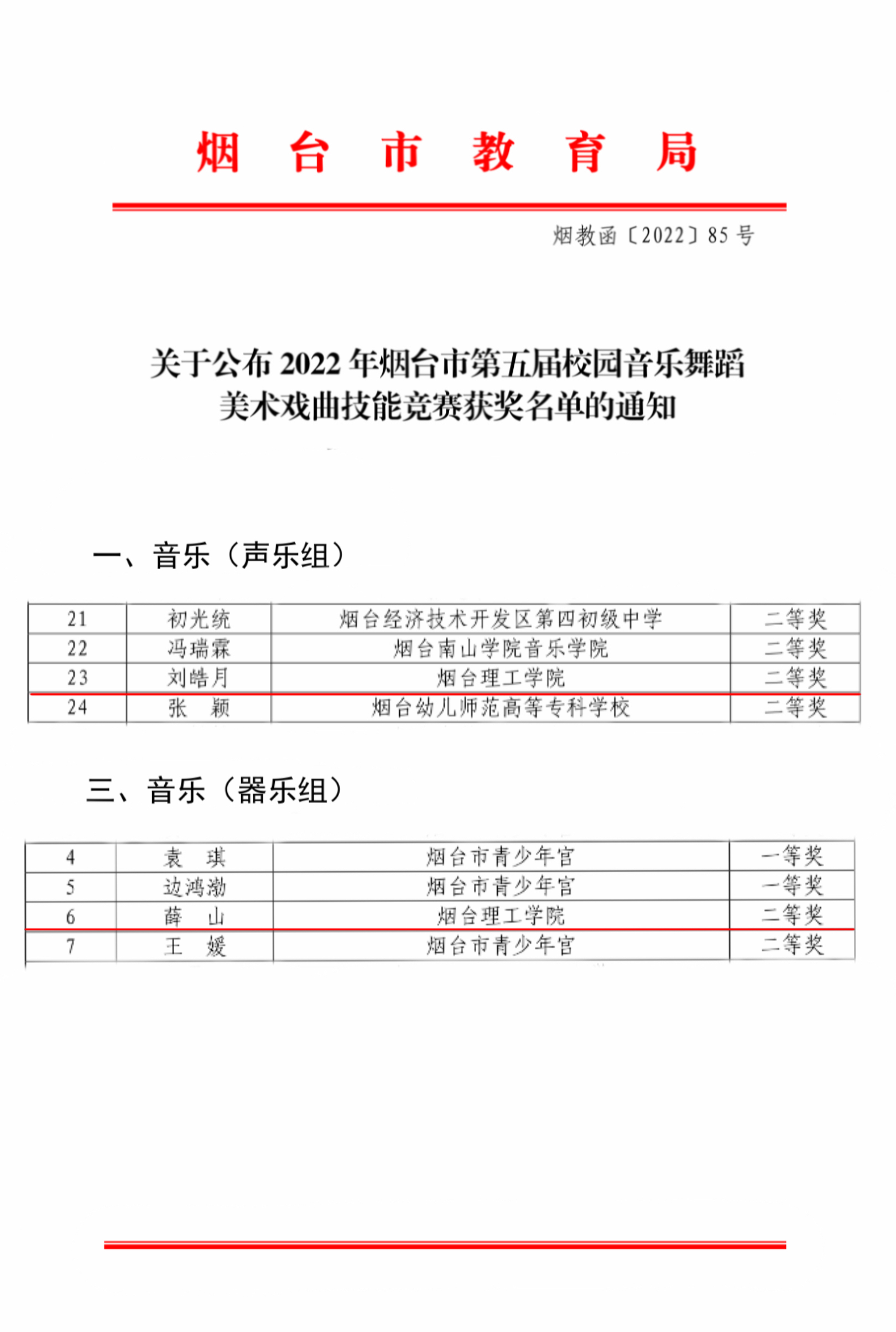 近日,2022年烟台市第五届校园音乐舞蹈美术戏曲技能竞赛落下帷幕,我校公共艺术中心教师刘皓月、薛山分别获声乐组、器乐组二等奖。