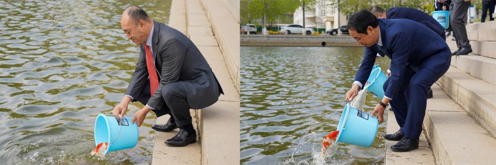 现场领导、老师和学生代表在后勤处和保卫处组织和保障下分批次有序进行锦鲤放养,2000尾锦鲤在水中自由自在地摇曳,吸引师生们纷纷驻足,琴心湖更加富有生机。锦鲤是吉祥的象征,寓意着幸福和成功,祝福烟台理工学院凝聚振奋,续写辉煌,希望同学们把握好青春时光,努力学习,拥有更加美好的锦绣前程。