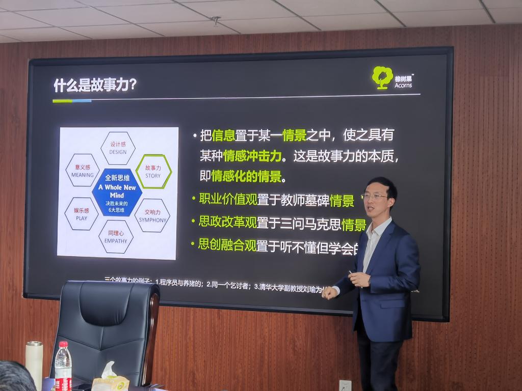 吴老师首先通过分享一位学生关于“世界末日”问题的幽默回答吸引在座教师的兴趣,结合自身价值观故事、自我革命故事、实践故事,教育教学感悟和课程思政实践经验,深度剖析了如何开展教学引导、通过生动鲜活的教学案例分享,阐述了课程思政的内涵和价值。吴老师通过列举相关工作实例,以“人生故事,故事人生,用故事说故事力”,剖析了教师在课堂及工作采用“反思+反馈”方式的重要性;将多年积累的宝贵工作经验娓娓道来,深入浅出地阐述了教师应如何建构育人力与故事力。吴老师与参会人员进行了交流,就教师的提问给出了相应的建议或指导方案,各参会教师纷纷表示受益匪浅,将会运用到教学与学生管理工作实践中。