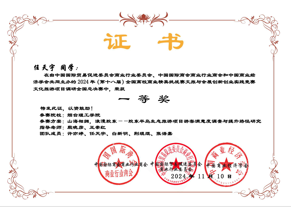 近日,第十八届全国高校商业精英挑战赛文旅与会展创新创业实践竞赛全国总决赛圆满落下帷幕。经济管理学院学生许亦婷、任天宇、荆煜焜、张语嘉与建筑工程学院学生白新明组成的星辰大海团队在殷晓彦、王崇红两位老师的指导下不断打磨作品,历经层层选拔,在全国总决赛中取得了一等奖的优异成绩。