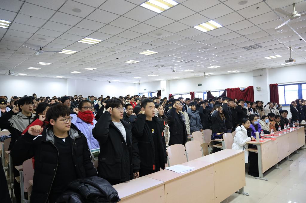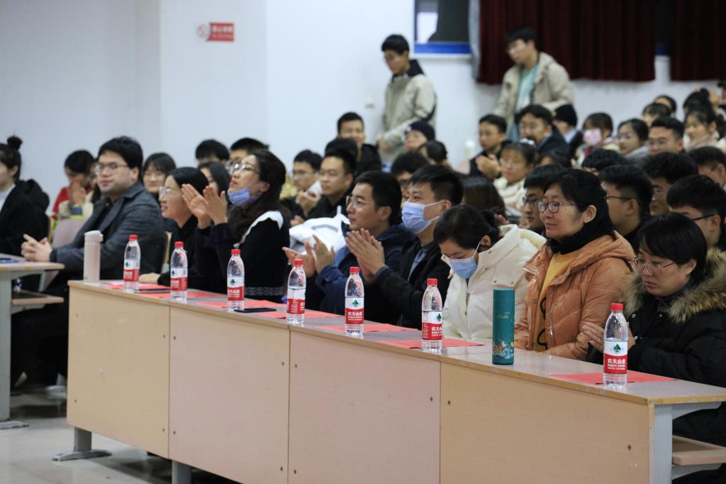 院长、党总支书记金海珠总结发言,他对获得表彰的师生表示祝贺,对一年来为学院发展作出贡献的全体师生表示感谢。希望大家都能向今天获表彰的师生学习,以他们为榜样。师德师风和学风建设始终是学院的重要工作,要常抓不懈。最后,学习部部长陆莹莹带领全体学生作诚信考试宣誓。